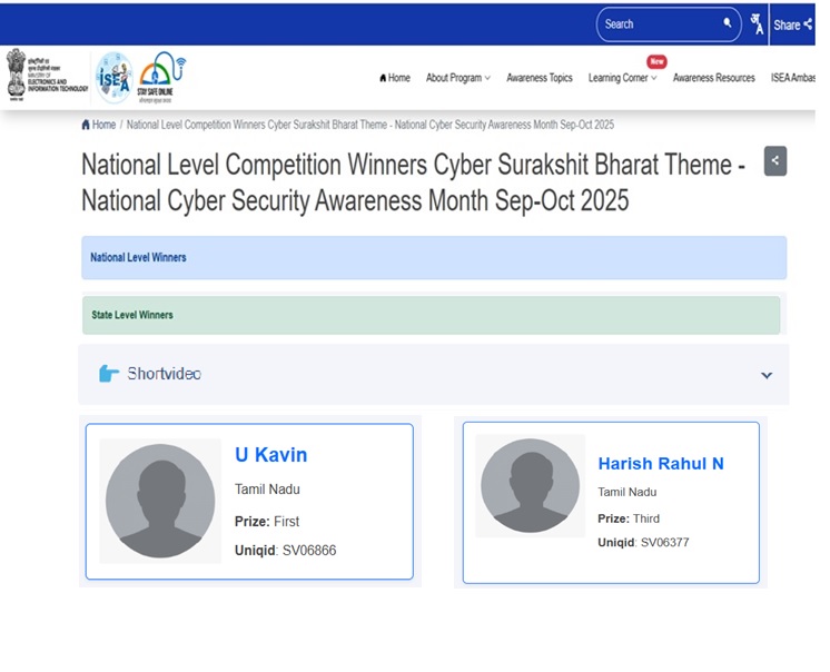 Cyber Surakshit Bharat-A National Level Cyber Security Awareness competition was conducted by Ministry of Electronics and Information Technology in the month of September online.We are delighted to inform that In Cartoon Story board Gayathre Shankar of XII E got the second place in State level.In Short video,U Kavin of XI A got the 1st place and Harish Rahul of XII G got the 3rd place in the state level